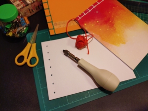 Jedes Kind konnte sein eigenes Buch gestallten. Es gab verschiedene Motive für die Vorder- und Rückseite zur Auswahl. Diese mussten dann zunächst auf das Maß der Buchseiten zugeschnitten werden. Anschließend haben wir Vorder- und Rückseite mit einem Papierbohrer gelocht. Für die Fadenbindung gab es wieder verschiedene Farben zur Auswahl.